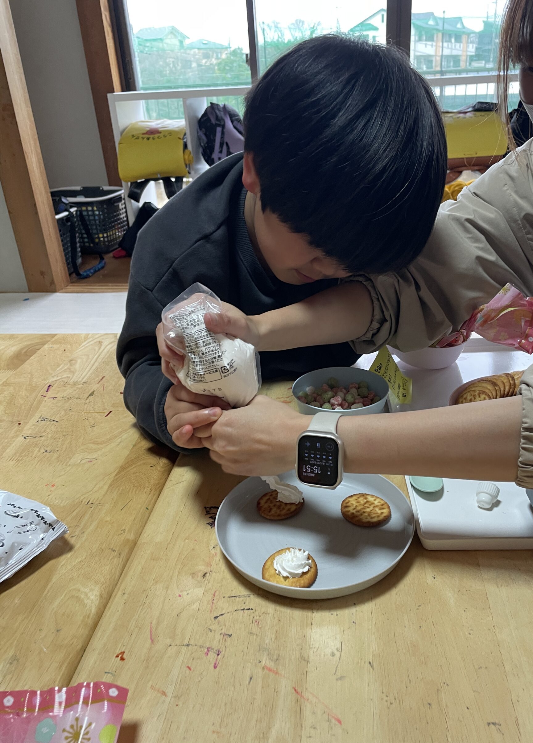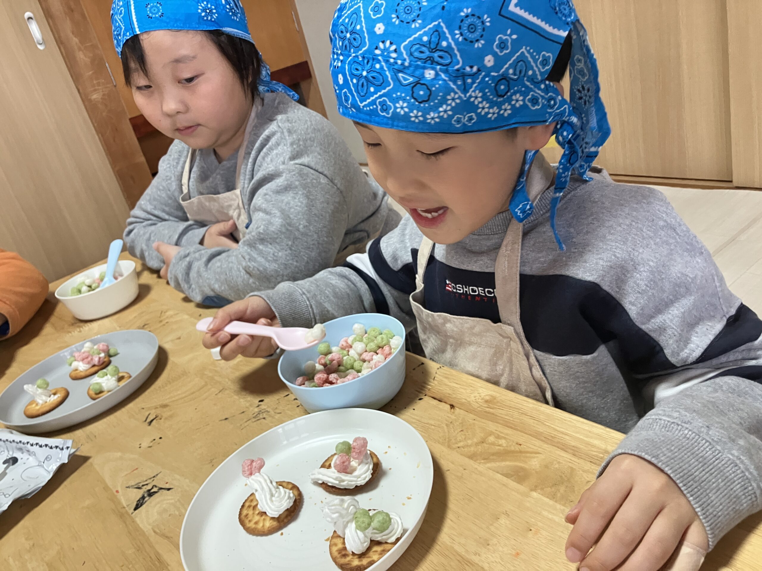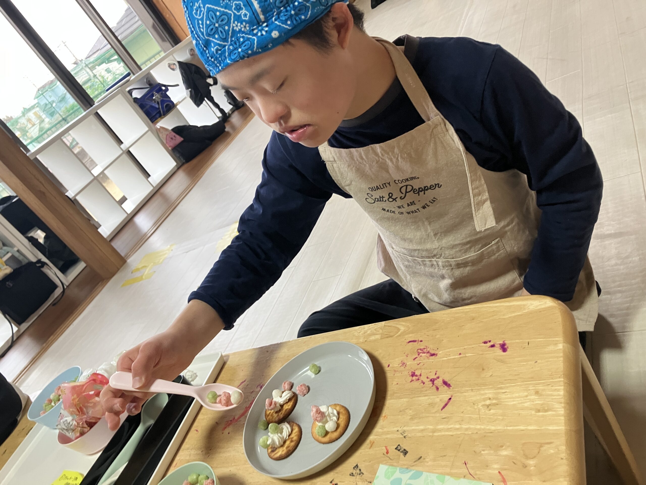 ひなあられクラッカーチームは、クリームを乗せ一つ一つ丁寧にひなあられを乗せることができました!職員の話も聞きながら丁寧に作ることができました😁